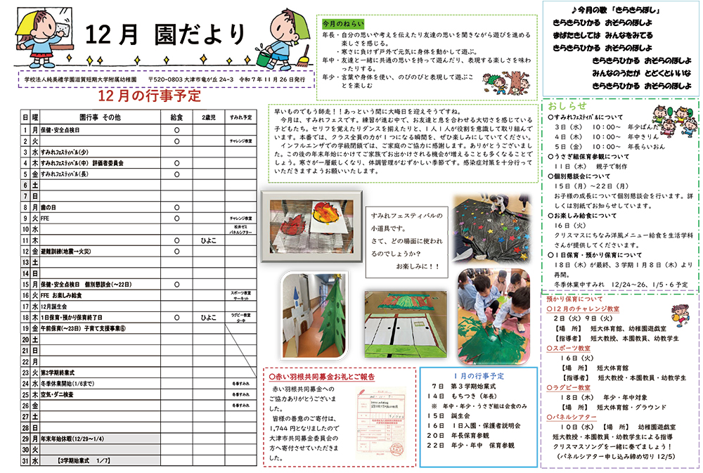 幼稚園の予定やご家庭への連絡事項などを掲載した園だよりを発行しています。 下記リンクをクリックして表示させるか、ダウンロードしてからご覧ください。