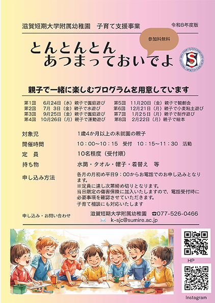 | 申 込 | 各月の月初め平日9:00~お電話で申し込みください。 ※定員に達し次第締め切りとなります。 ※1月は4日9:00~ TEL.077-526-0466 |