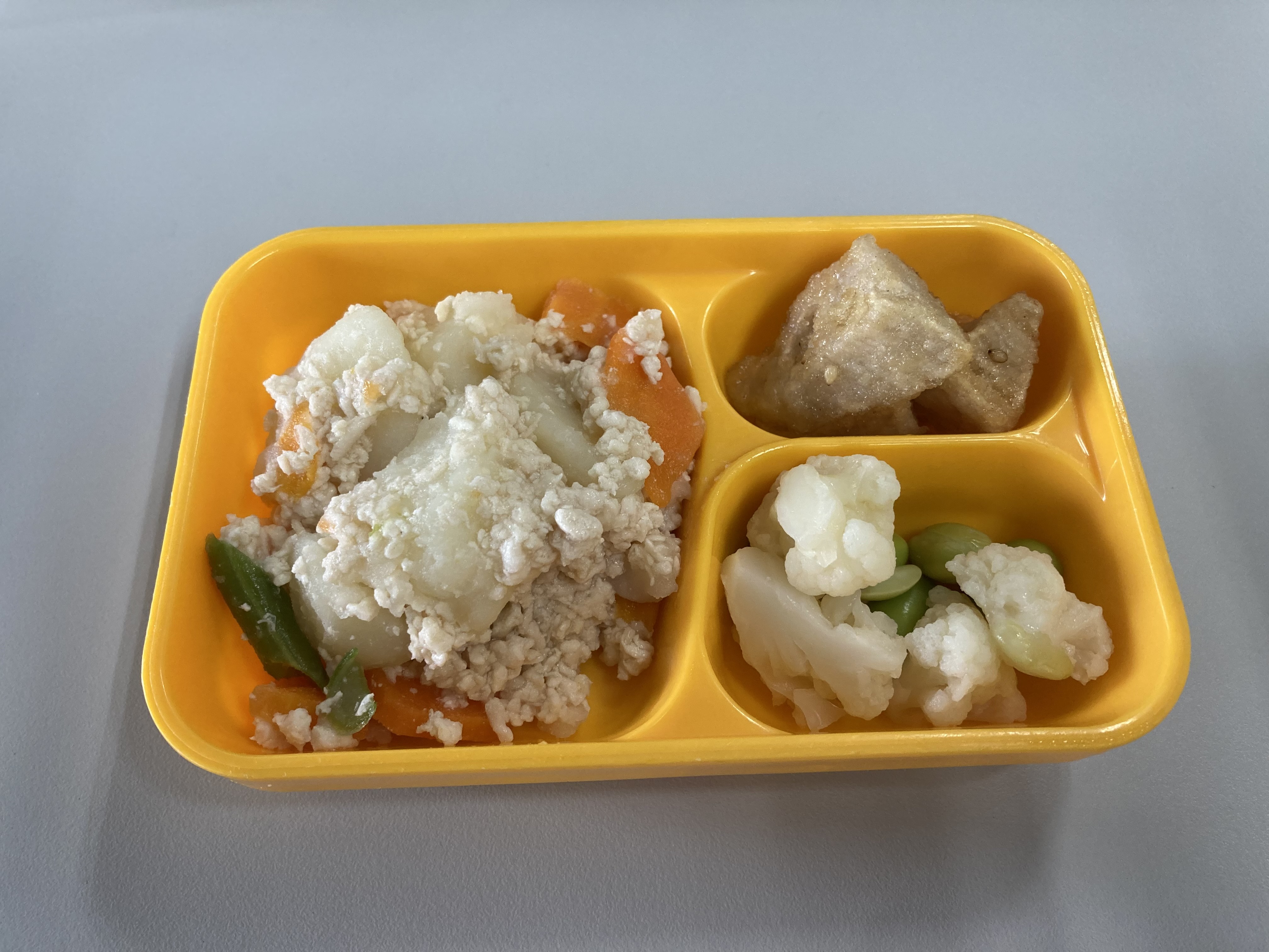 白米 58g 菜めし 1.5g かぼちゃひき肉フライ 1個 油 5g ブロッコリー 10g カリフラワー 10g ベーコン 5g 野菜ブイヨン 0.5g カレー粉 0.3g 塩コショウ 0.05g 油 3g 人参 15g わかめ 0.3g 和風ドレッシング 2.5g 塩コショウ 0.1g 砂糖 1g