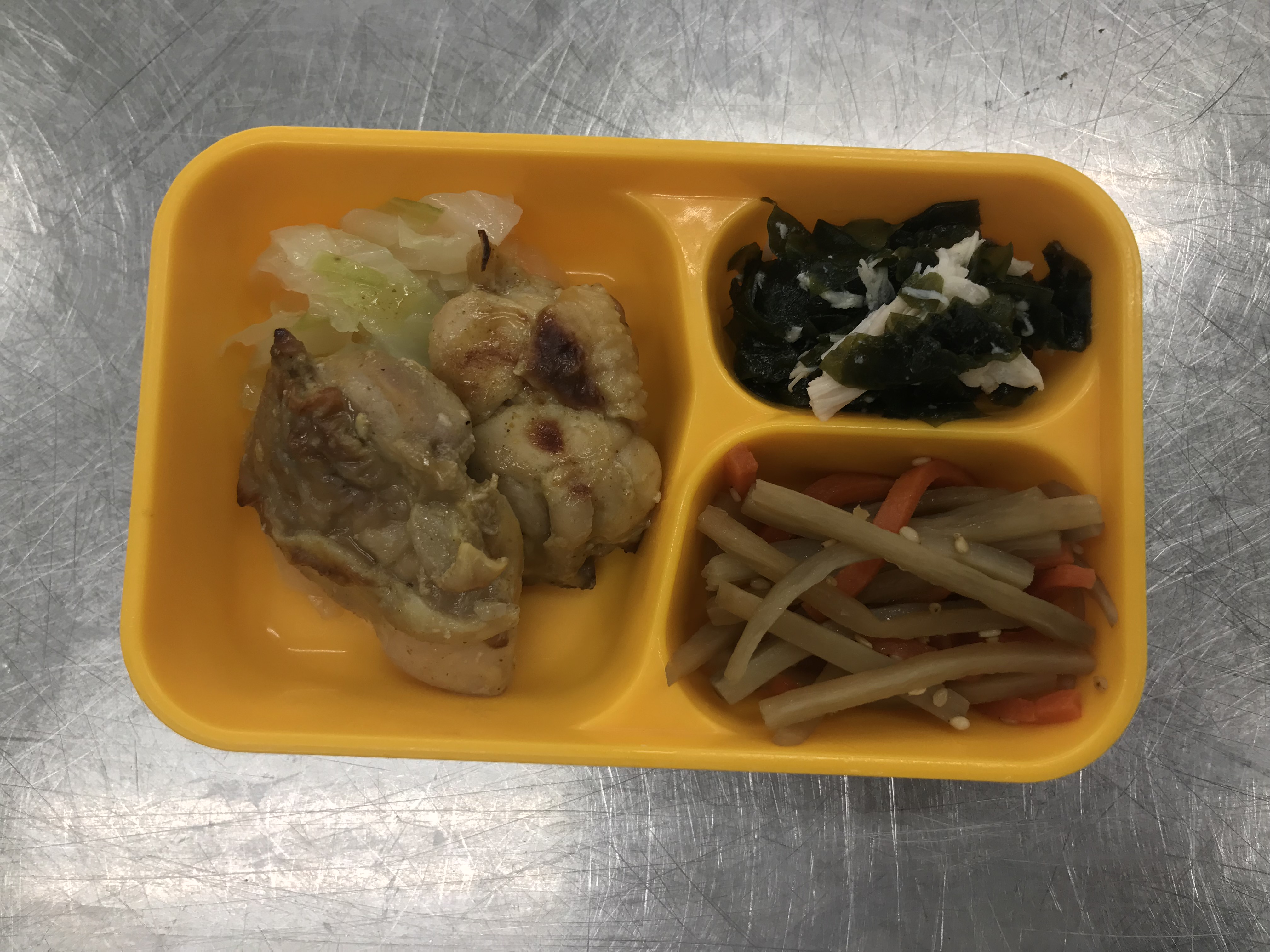 白ごはん 鶏肉のカレー焼き キャベツソテー 金平ごぼう わかめのさっと煮