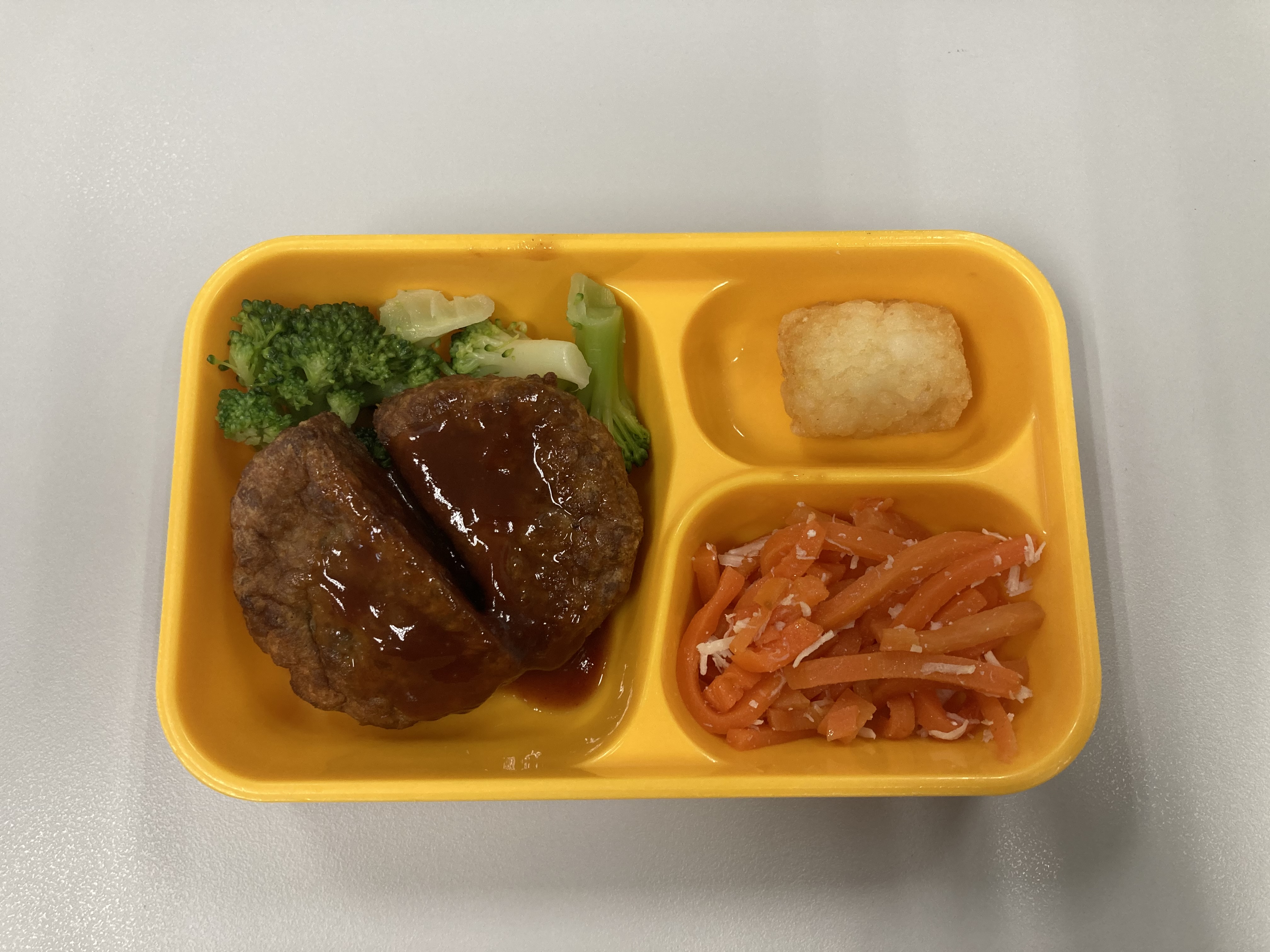 白ごはん ハンバーグ ブロッコリーソテー ハッシュドポテト 人参のマリネ