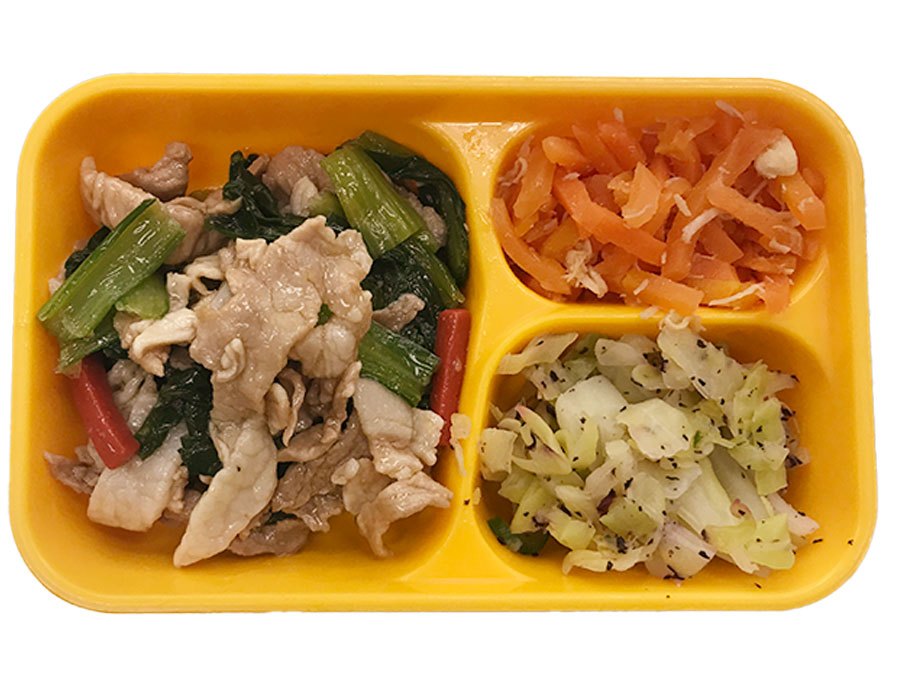 白米 58g 豚肉 40g 小松菜 20g もやし 20g だしの素 0.5g にんにく 1g 生姜 1g 料理酒 1g 薄口醤油 1g 砂糖 2g 油 3g でんぷん 2g 赤こんにゃく 20g おかか 0.3g だしの素 0.3g 砂糖 1g みりん 1g 濃口醤油 1.5g 料理酒 1g 水煮大豆 15g でんぷん 1.5g カレー粉 0.1g 塩コショウ 0.1g 油 3g