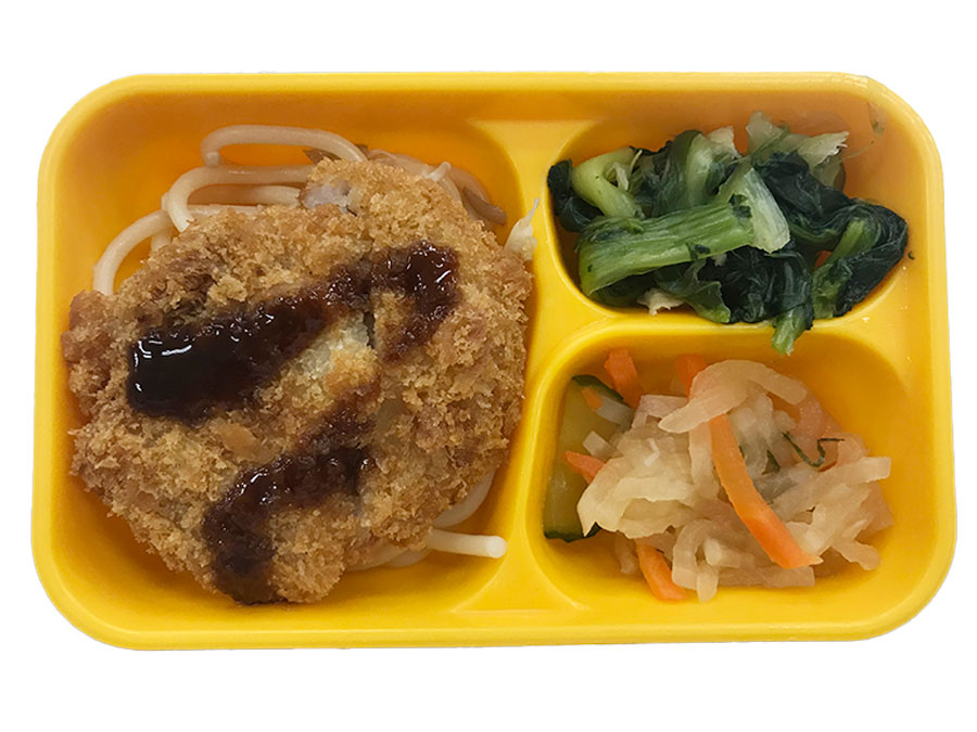 白米 58g チーズ風ソースインハンバーグ 1個 油 5g てりやきのたれ 2g 小松菜 20g 人参 5g 高野豆腐 1g だしの素 0.2g 薄口醤油 1g 砂糖 0.5g みりん 1g でんぷん 0.2g ごぼう 20g 枝豆 3g だしの素 0.2g ノンエッグマヨネーズ 3g 塩コショウ 0.1g
