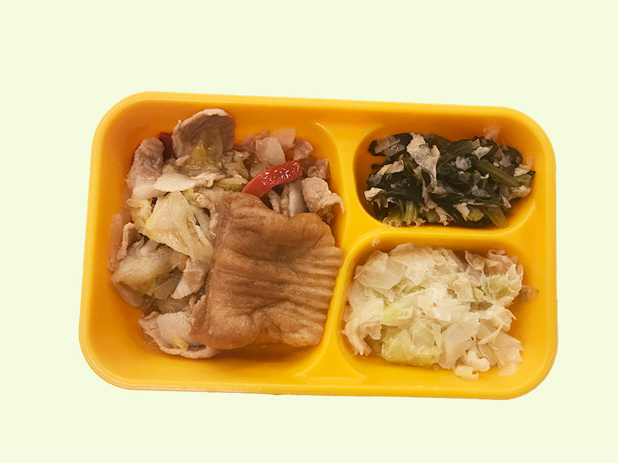 白米 58g 豚肉 40g 小松菜 20g もやし 20g だしの素 0.5g にんにく 1g 生姜 1g 料理酒 1g 薄口醤油 1g 砂糖 2g 油 3g でんぷん 2g 赤こんにゃく 20g おかか 0.3g だしの素 0.3g 砂糖 1g みりん 1g 濃口醤油 1.5g 料理酒 1g 水煮大豆 15g でんぷん 1.5g カレー粉 0.1g 塩コショウ 0.1g 油 3g