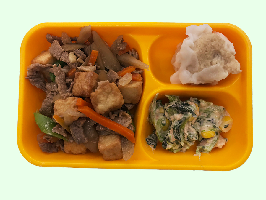 白米 58g 豚肉 40g 小松菜 20g もやし 20g だしの素 0.5g にんにく 1g 生姜 1g 料理酒 1g 薄口醤油 1g 砂糖 2g 油 3g でんぷん 2g 赤こんにゃく 20g おかか 0.3g だしの素 0.3g 砂糖 1g みりん 1g 濃口醤油 1.5g 料理酒 1g 水煮大豆 15g でんぷん 1.5g カレー粉 0.1g 塩コショウ 0.1g 油 3g