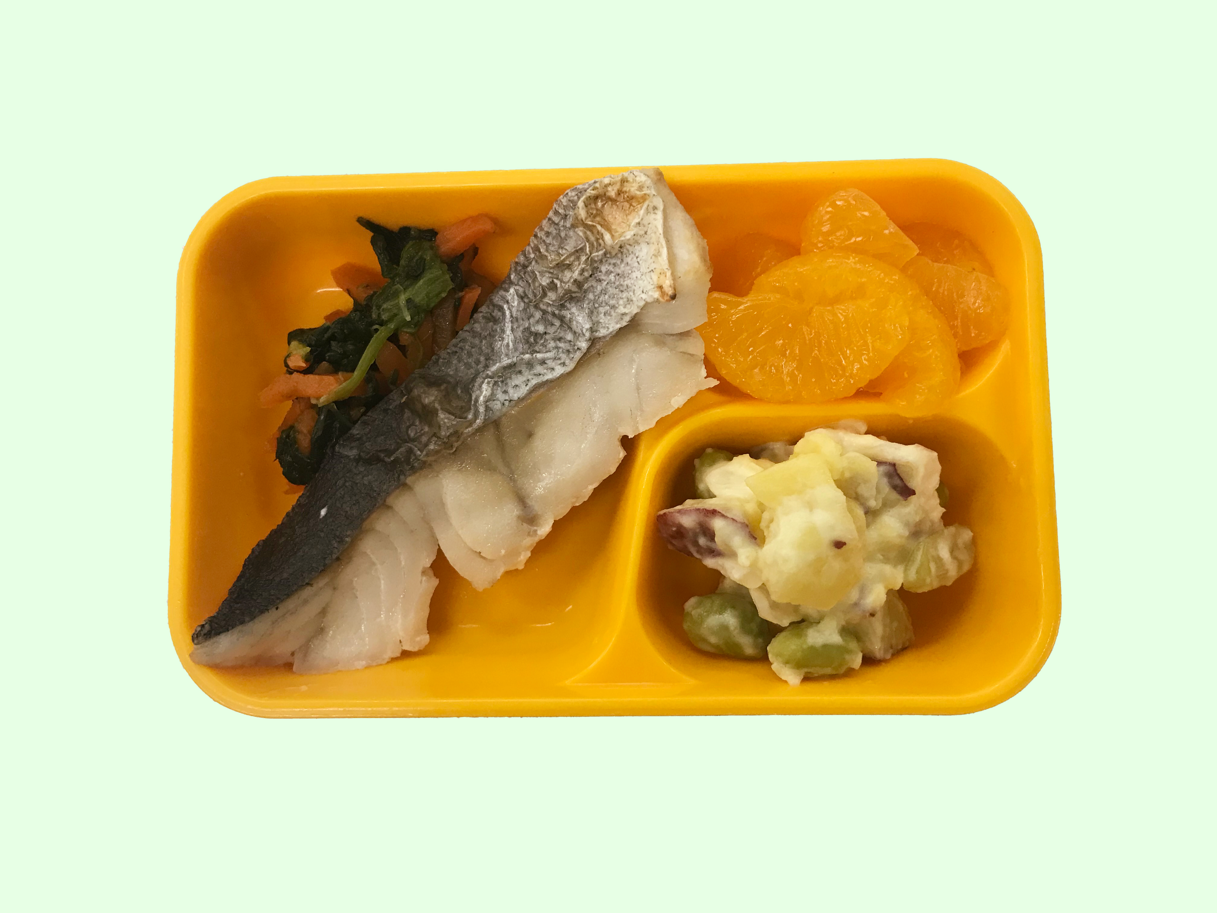 白ごはん たらのムニエル ほうれん草と人参の炒め物 さつまいもサラダ みかん缶