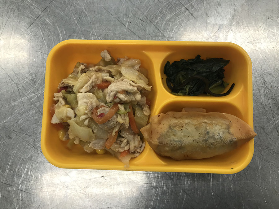 白ごはん 豚肉とキャベツの中華炒め 揚げ餃子 小松菜の昆布和え