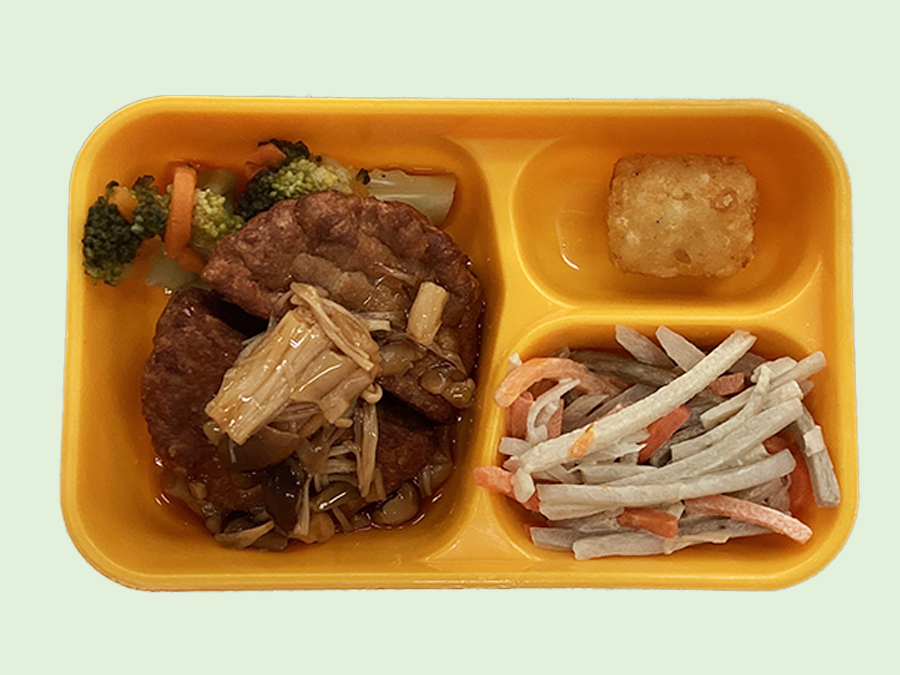白米 58g チーズ風ソースインハンバーグ 1個 油 5g てりやきのたれ 2g 小松菜 20g 人参 5g 高野豆腐 1g だしの素 0.2g 薄口醤油 1g 砂糖 0.5g みりん 1g でんぷん 0.2g ごぼう 20g 枝豆 3g だしの素 0.2g ノンエッグマヨネーズ 3g 塩コショウ 0.1g