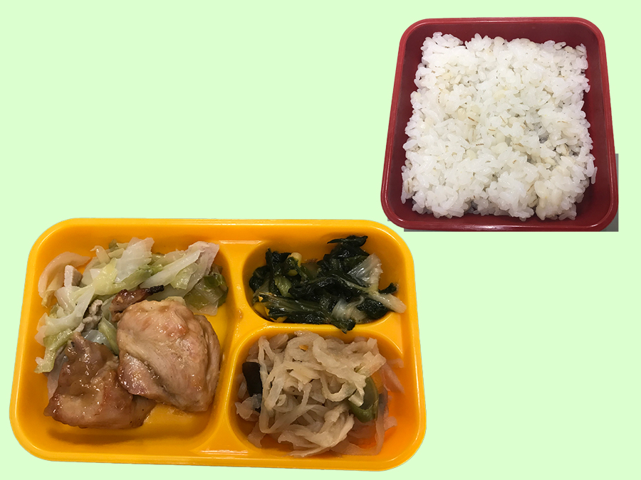 麦ごはん 鶏の照り焼き キャベツソテー 切り干大根煮 しろ菜のサラダ