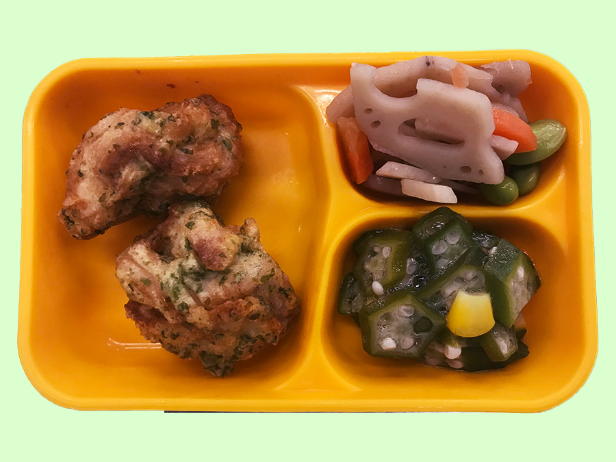 白ごはん 鶏の天ぷら磯辺風味 れんこんの炒め煮 オクラの梅和え