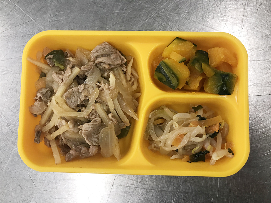 白米 58g 豚肉 40g 小松菜 20g もやし 20g だしの素 0.5g にんにく 1g 生姜 1g 料理酒 1g 薄口醤油 1g 砂糖 2g 油 3g でんぷん 2g 赤こんにゃく 20g おかか 0.3g だしの素 0.3g 砂糖 1g みりん 1g 濃口醤油 1.5g 料理酒 1g 水煮大豆 15g でんぷん 1.5g カレー粉 0.1g 塩コショウ 0.1g 油 3g