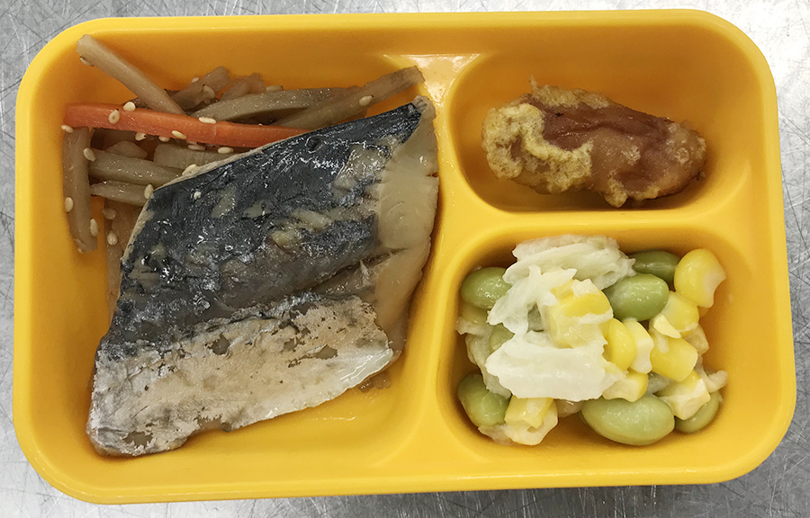 白ごはん さわらの煮付け 金平ごぼう 枝豆とコーンのサラダ ウインナーのカレー天ぷら