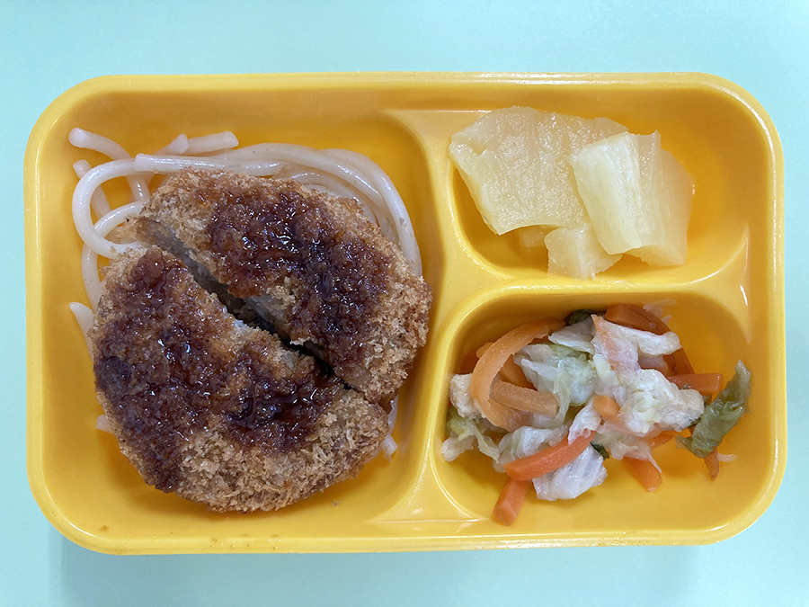 白ごはん メンチカツ スパゲティソテー 白菜の煮浸し パイン缶