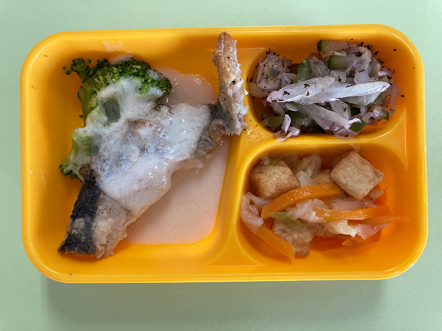 白米 58g たら 1枚 塩コショウ 0.5g 天ぷら粉 10g あおさ 0.3g 油 8g じゃがいも 15g 油 5g ウインナー 5g 玉葱 5g にんにく 0.1g 野菜ブイヨン 0.5g パセリ 0.1g 塩コショウ 0.1g キャベツ 20g 人参 3g 薄口醤油 1g だしの素 0.5g 砂糖 0.5g