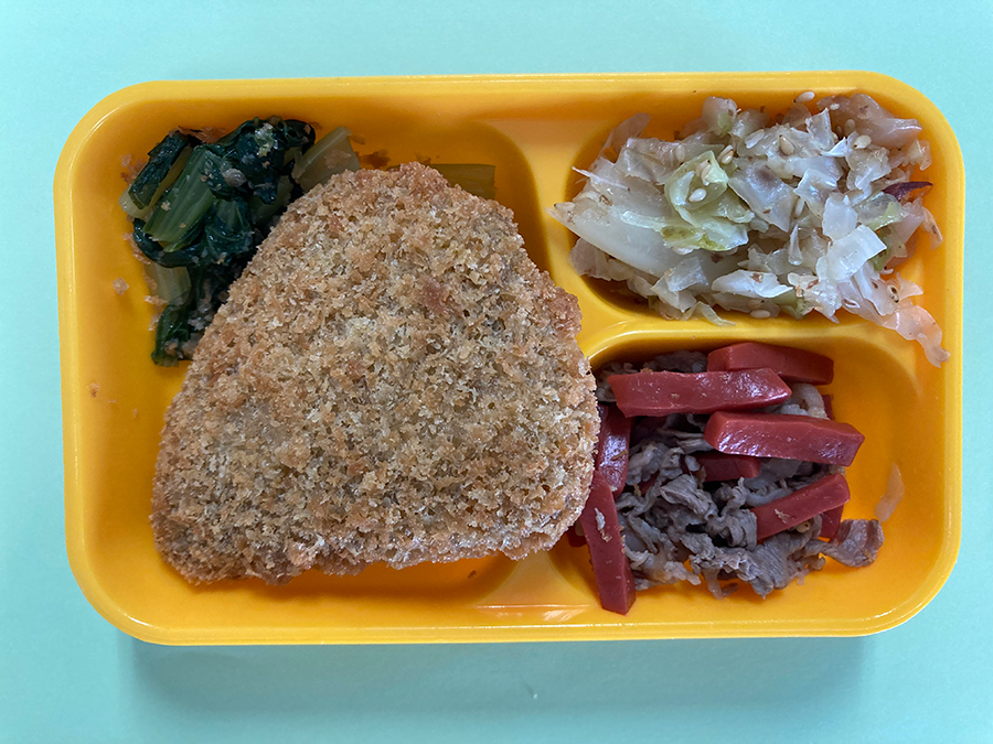 白米 58g 菜めし 1.5g かぼちゃひき肉フライ 1個 油 5g ブロッコリー 10g カリフラワー 10g ベーコン 5g 野菜ブイヨン 0.5g カレー粉 0.3g 塩コショウ 0.05g 油 3g 人参 15g わかめ 0.3g 和風ドレッシング 2.5g 塩コショウ 0.1g 砂糖 1g