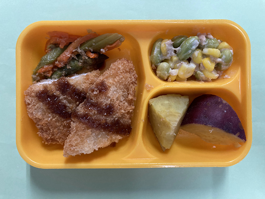 白ごはん ささみカツ アスパラのソテー 枝豆とコーンのサラダ さつまいもの甘煮