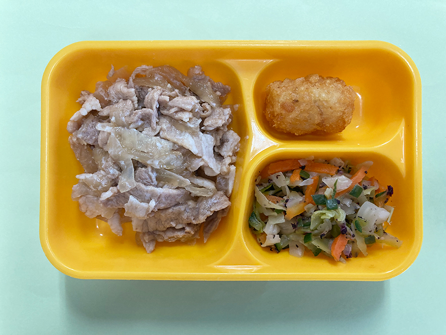 白ごはん 豚肉の生姜炒め キャベツのゆかり和え ハッシュドポテト
