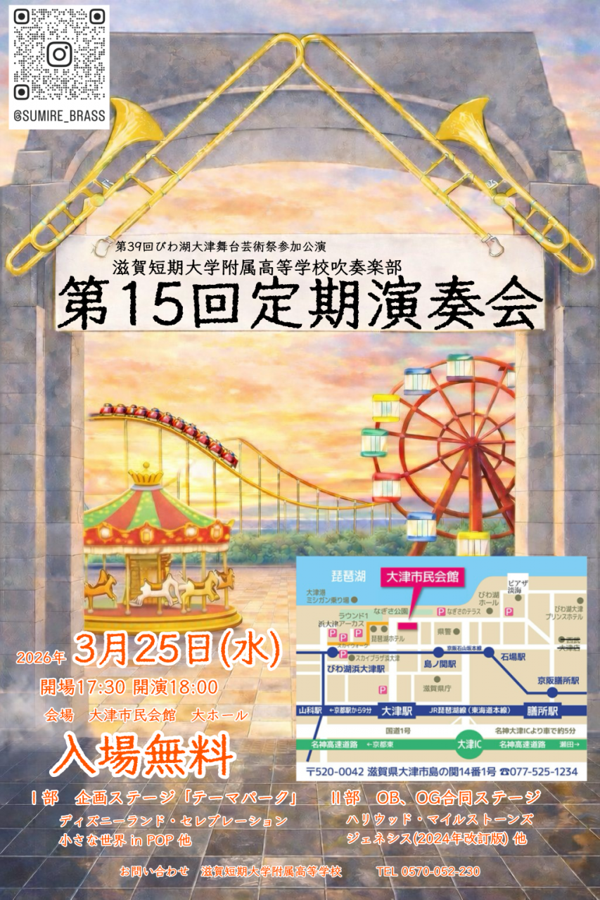 2026.03.05 お知らせ 吹奏楽部定期演奏会 2026年3月5日 本校吹奏楽部が定期演奏会を開催します。 3月25日(水)17:30開場 18:00開演 入場無料 大津市民会館大ホール 大津市島の関14−1 皆様のご来場をお待ちしております!