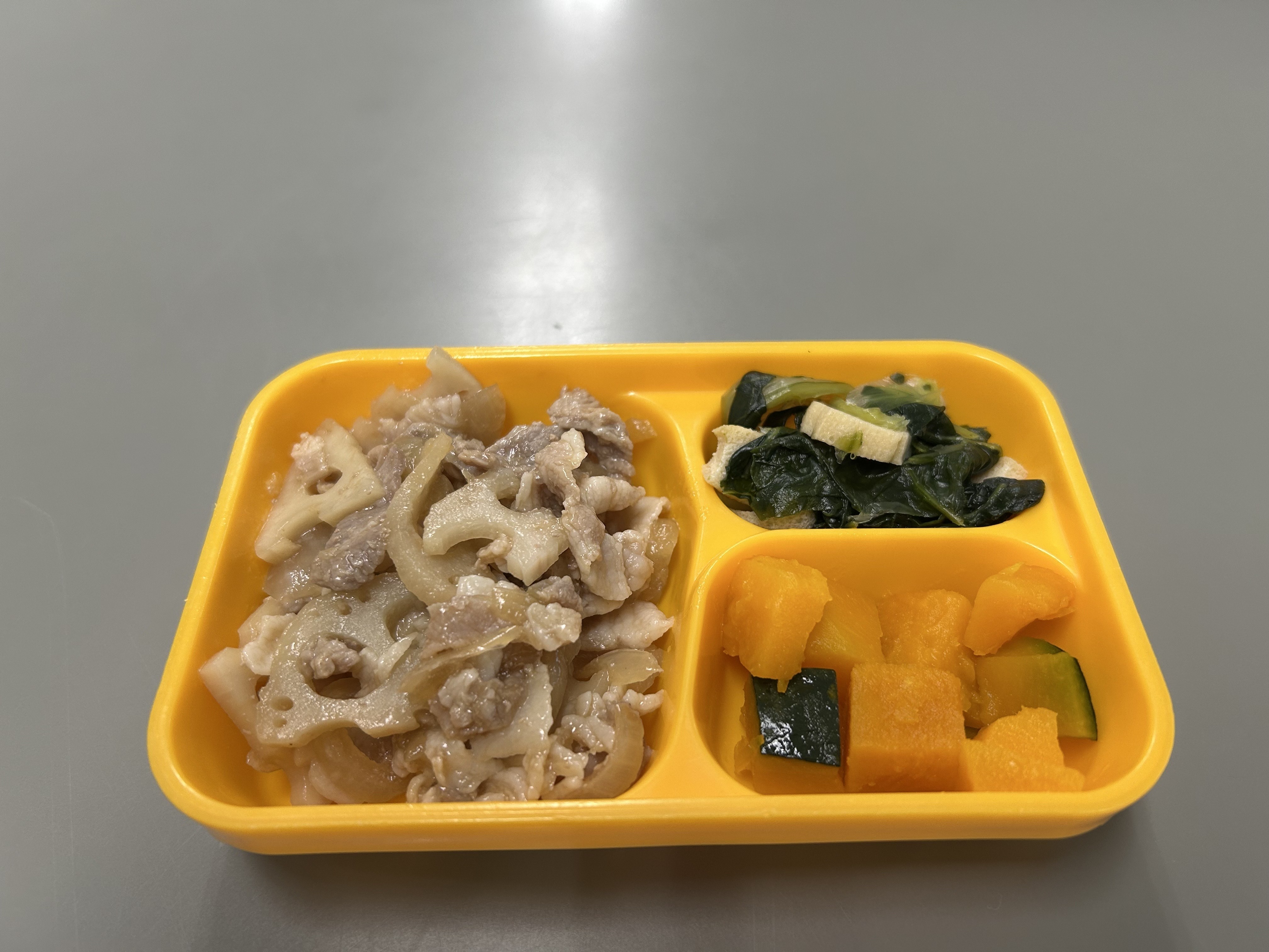 麦ごはん 豚肉とれんこんの甘辛炒め かぼちゃの煮物 小松菜と揚げの煮物