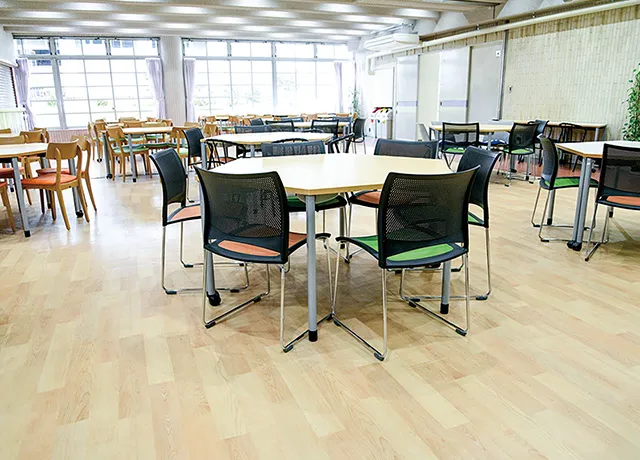 琵琶湖が一望でき、大きな窓から光がいっぱい差し込む食堂。味、栄養、ボリュームに配慮したメニューがそろっています。