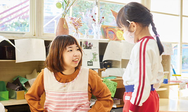 今は5歳児の担任をしています。物作りや表現、運動、集団遊び、園内行事、園外での田植えや稲刈りなど、いろいろな保育をしています。活動記録などの書類を作成したり、保護者の方々への対応業務もあります。子どもたちと接する毎日は、喜びと驚きと新しい発見の連続です。ときには悩んだりすることもありますが、子どもたちの成長を一番近くで見守ることができるこの仕事に大きなやりがいを感じています。やはり、この仕事を選んで良かったと思います。