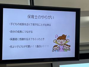 受講した学生からは、「公立と私立園の具体的な違いがよく分かった」「実習を前に抱いていた不安が少し軽くなった」といった前向きな感想が寄せられ、学生たちのキャリア意識の向上につながる貴重な機会となりました。
