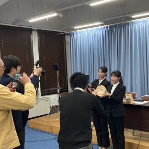本学のデジタルライフビジネス学科の学生2名が記者さんからの取材に答えました。